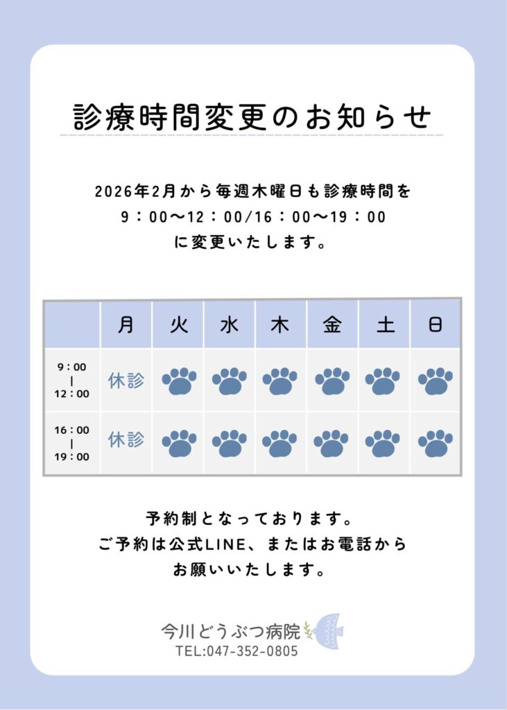 いつも今川どうぶつ病院をご利用いただきありがとうございます。